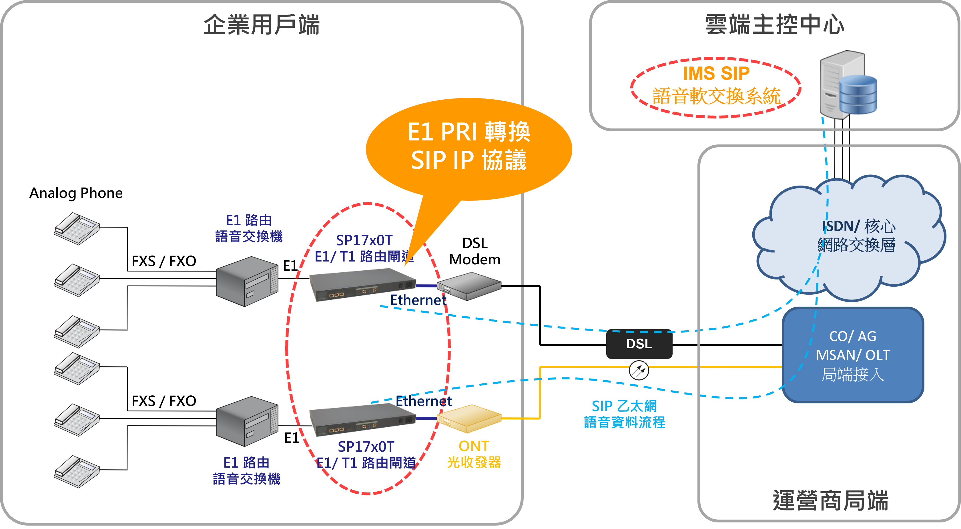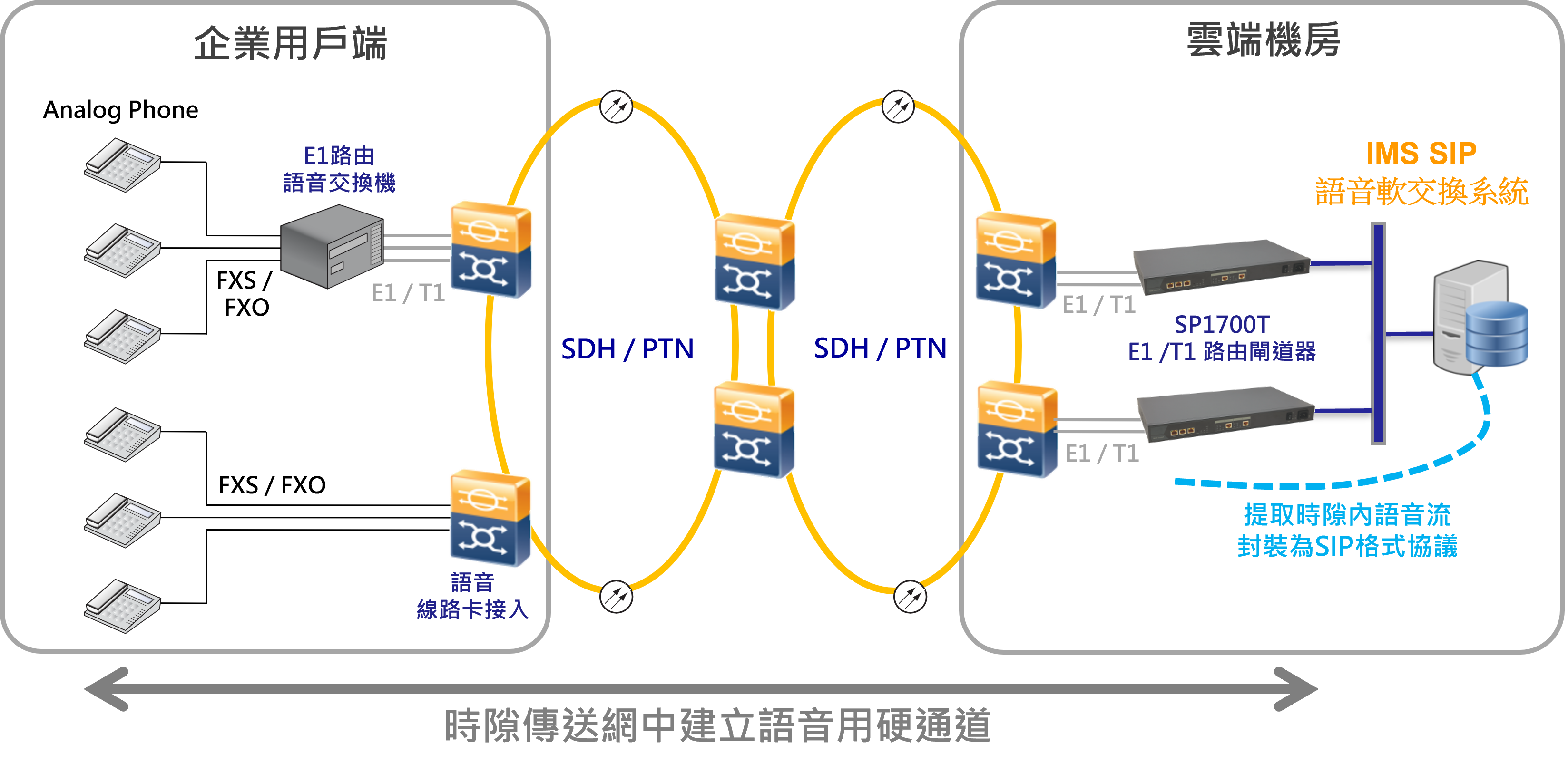 為了因應網路化、IP 化的趨勢,福億通訊打造可運行在 SDH/ PTN 承載網環境的 E1/ T1 閘道器,提取語音流後封裝為 SIP 格式,並讓語音註冊至 IMS (IP Multimedia Subsystem) 語音軟交換系統,或企業 IPPBX 語音軟交換系統。